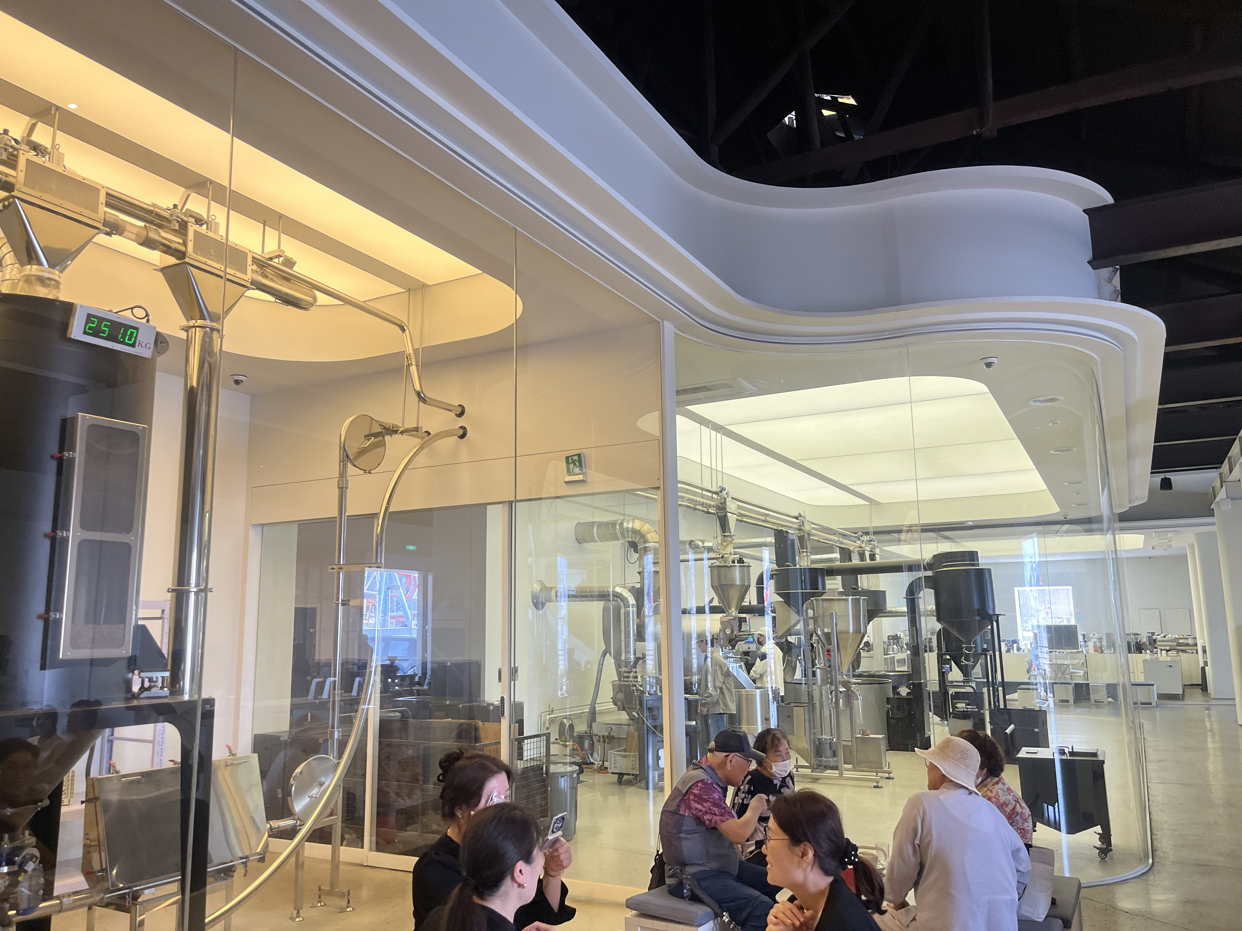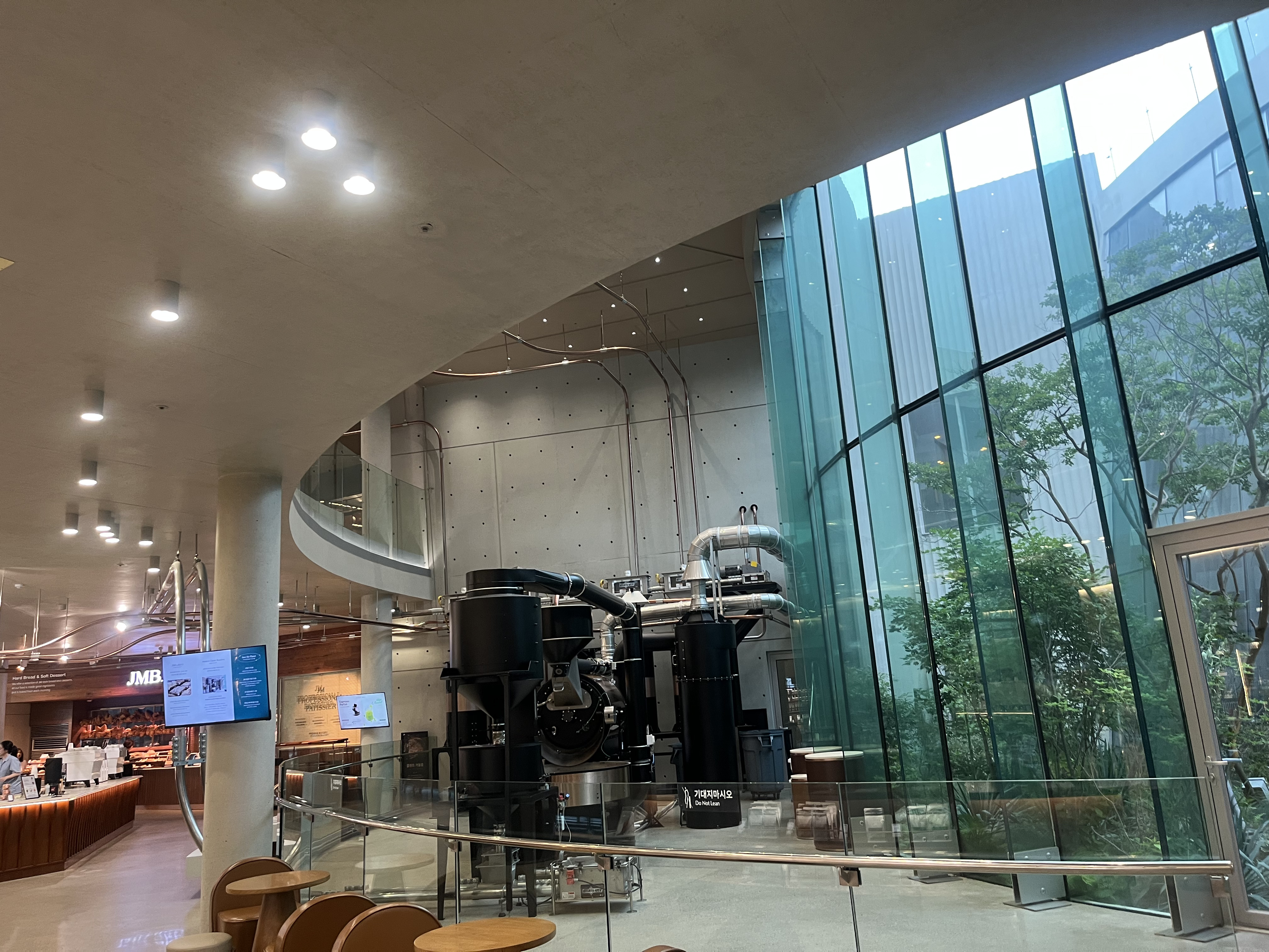 機張の大辺港にあるカフェJM Coffee Roasterに足を踏み入れると、まずその未来的な内装が目を奪う。大きな曲線を描く天井と、緑に囲まれたガラス張りの壁が自然光を取り込み、空間に穏やかな雰囲気を生み出している。店内中央には、洗練されたデザインの焙煎機が芸術品のように設置され、その黒と銅色のコントラストが技術と美の融合を象徴している。複数の焙煎タンクが整然と並ぶ姿は、コーヒーへのこだわりを物語る。店内には木製のテーブルと座席が配置され、階段状のデザインが訪れる者にリラックスした空間を提供している。 |