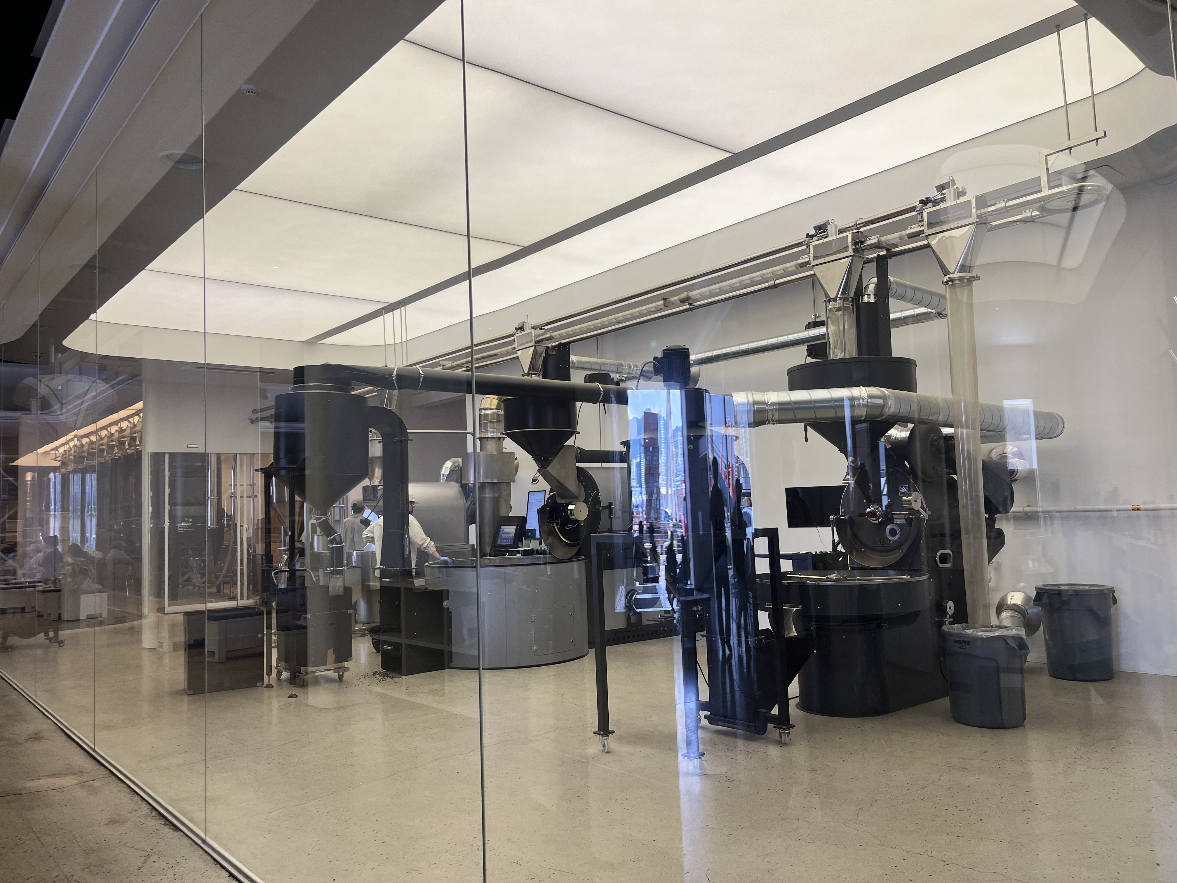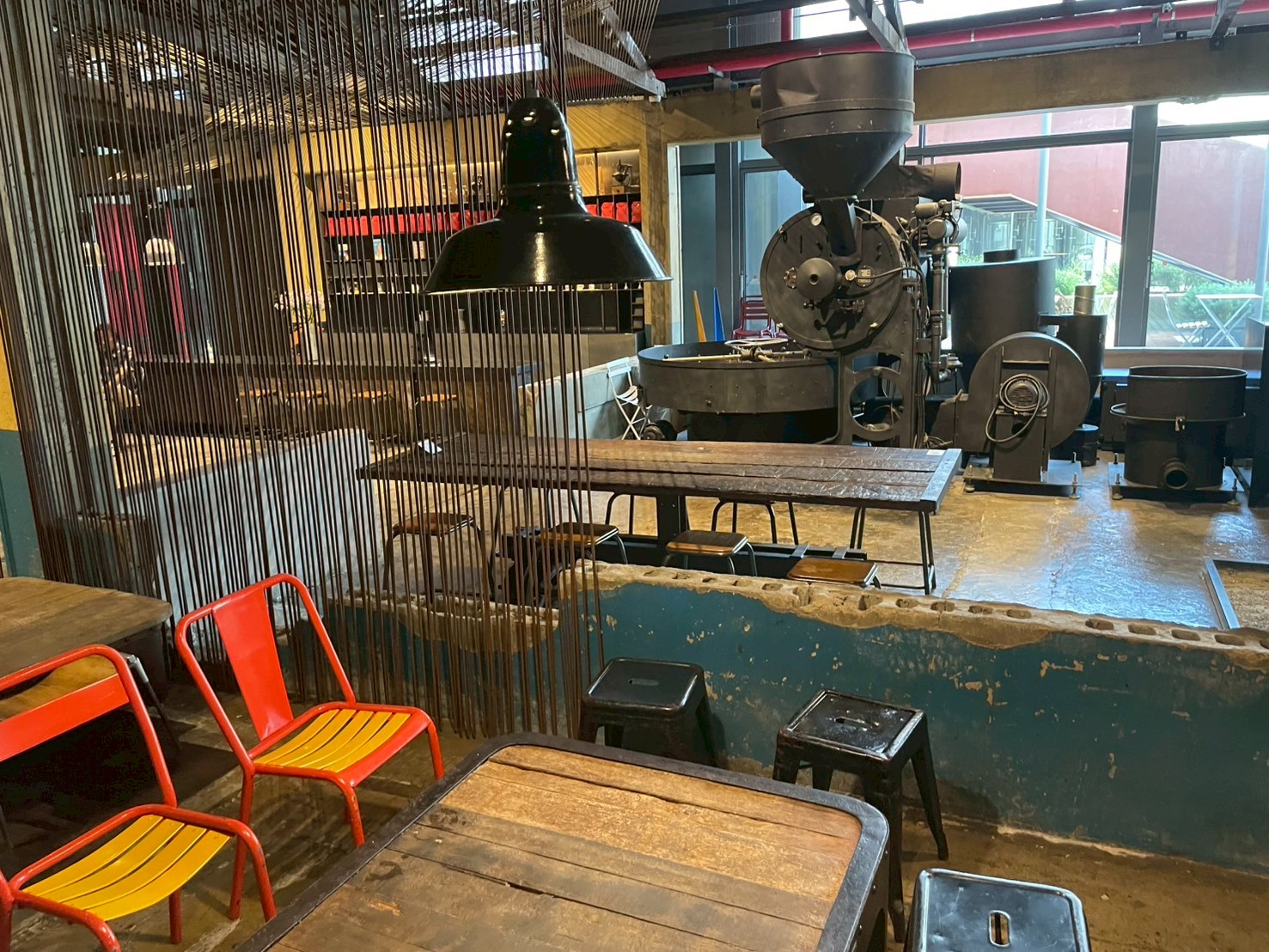 中央に堂々と構える焙煎機は、まるでこの空間の守護者のように存在感を放ち、金属の輝きとコーヒー豆の香りが調和して、訪れる者の心を掴んで離さない。