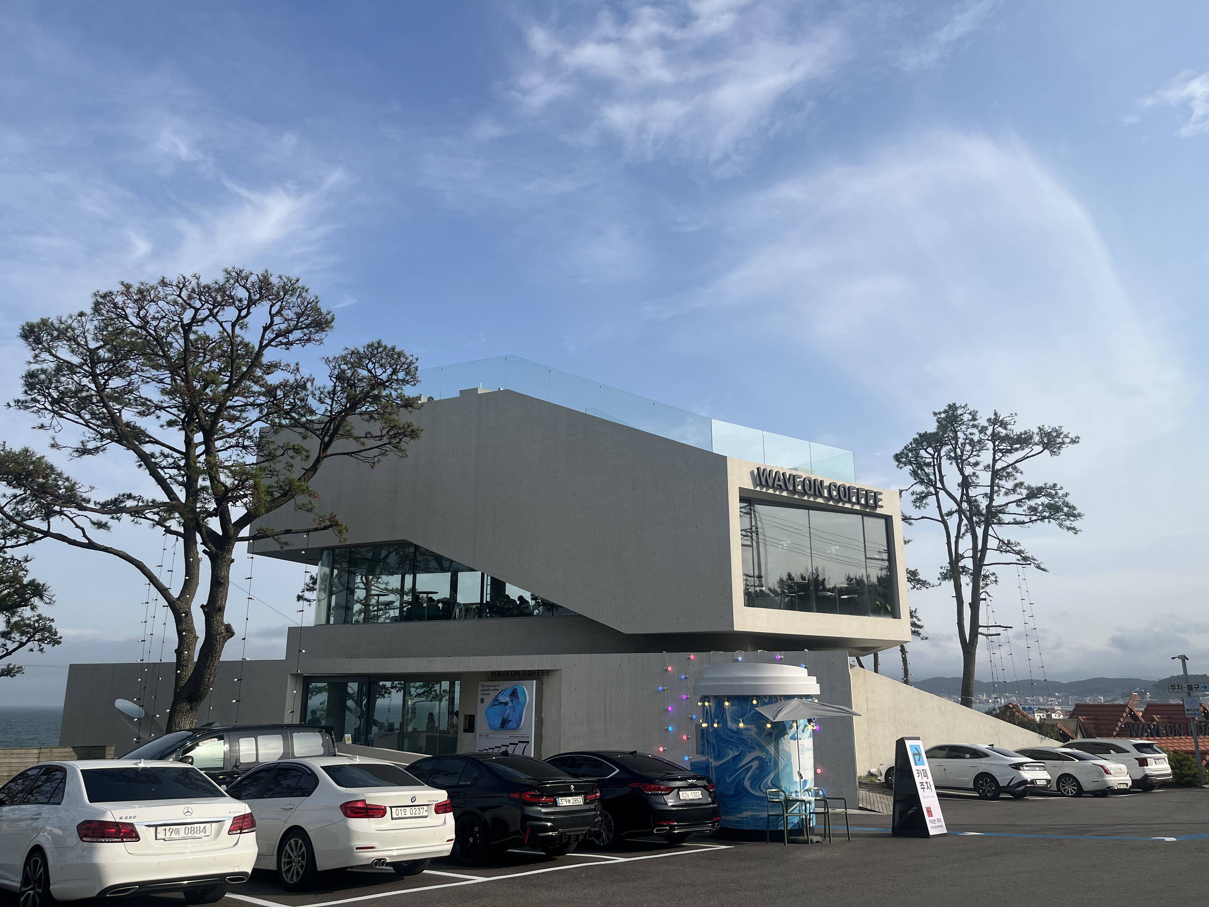 釜山の海岸線に佇むWaveon Coffeeは、モダンな外観が目を引く。外壁のロゴと大きなガラス窓が青空と調和し、海と一体化した建築のようだ。入口近くの巨大なコーヒーカップのモニュメントが訪れる者を迎える。駐車場には地元の人々の車が並び、日常の賑わいを感じさせる。