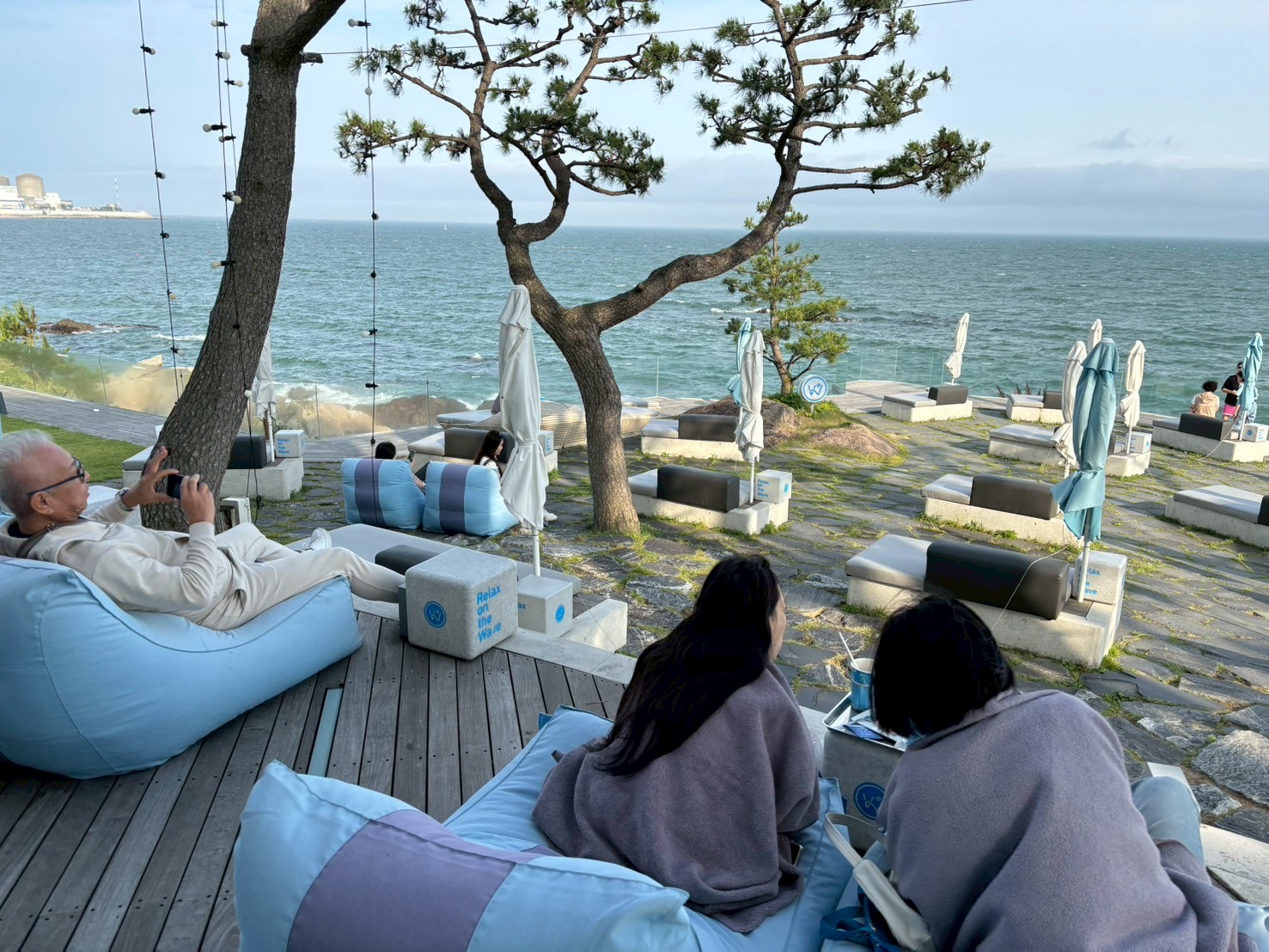 テラス席に腰を下ろすと、果てしない海と松の木々が織りなす風景が広がる。六角形のコンクリート製テーブルと青紫のクッションが、モダンさと自然の調和を演出する。遠くの船を眺めながらコーヒーをすすり、波に寄り添う穏やかな時間が流れる。地元の若者や観光客が静かに会話を楽しむ姿が、この場所の自由な精神を物語る。 |
